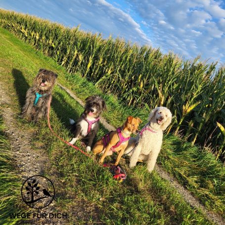 Auf Ihren Wunsch hin begleiten meine beiden Therapiebegleithündinnen unser Coaching-Einheiten. Céline und Klara haben jeweils 2016 und 2018 ihre Prüfungen mit mir gemeinsam bestanden. Céline ist auf dem Bild ganz rechts, Klara die 2. von links. Beide haben die Prüfung bei der TAT absolviert, Sitz in Österreich.