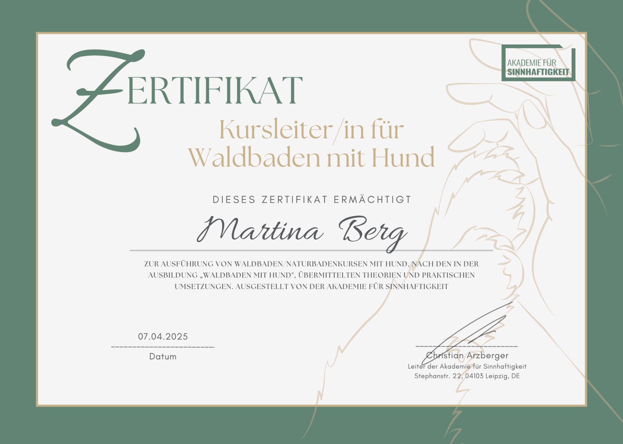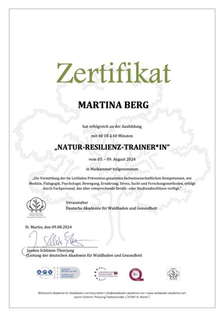 • Naturresilienztrainerin 2024 "Deutsche Akademie für Waldbaden und Gesundheit"